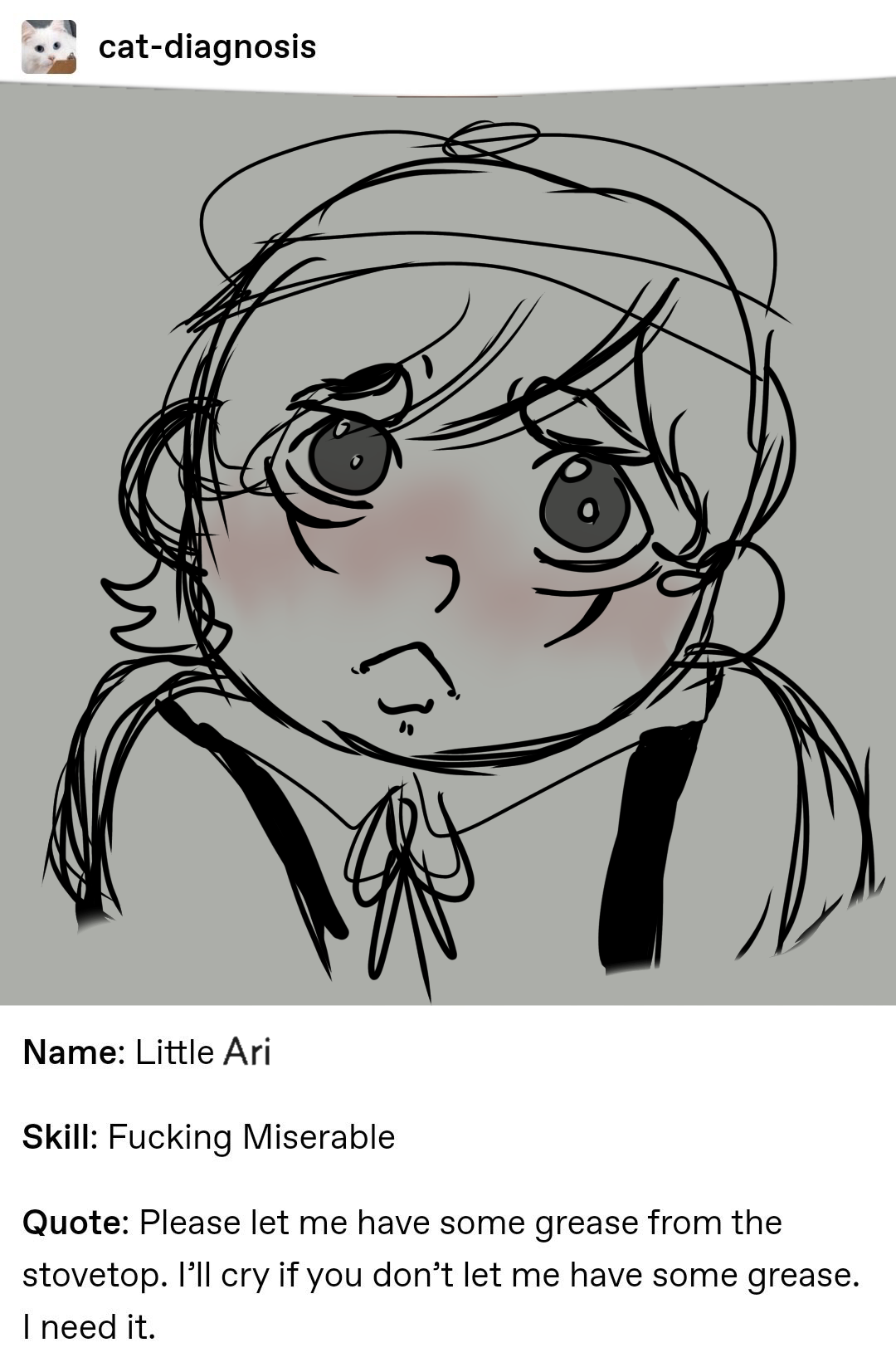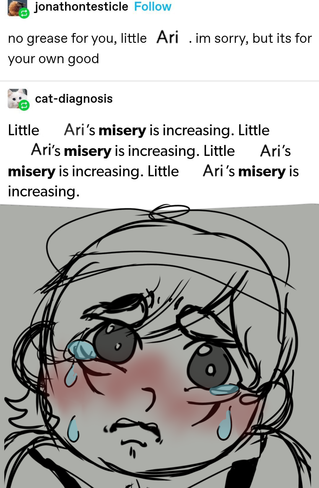 "description": "LITTLE ARIS MISERY IS INCREASING",